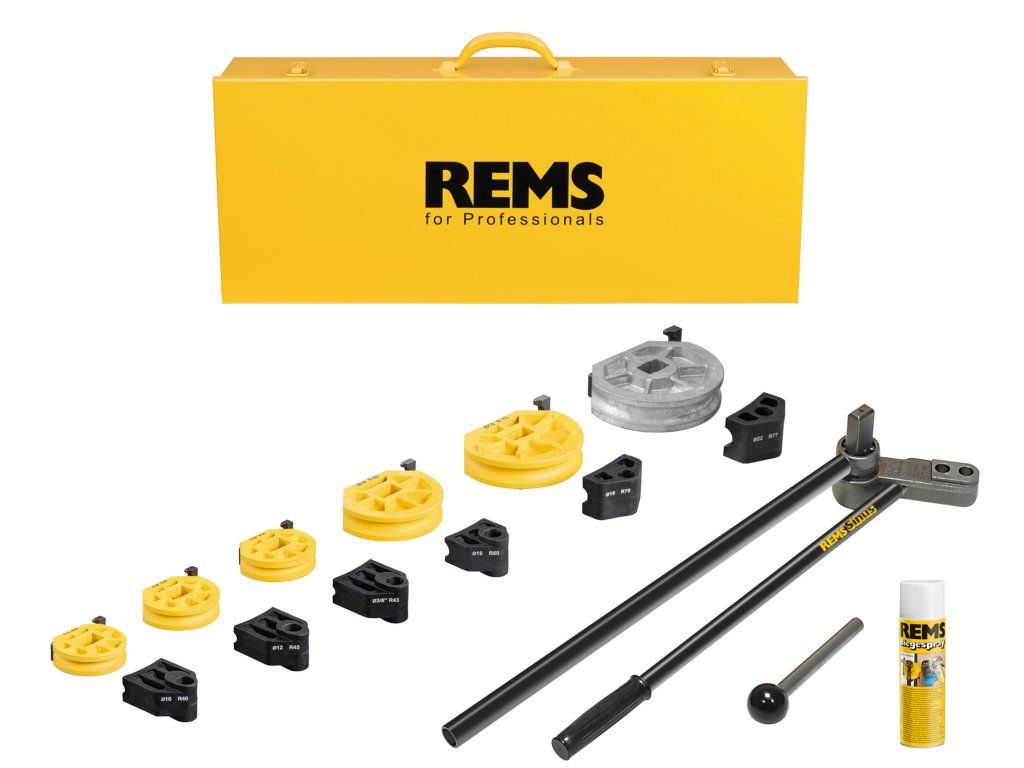 V pevném kufru z ocelového plechu. - REMS Sinus Set se dodává s ohýbacími segmenty a smýkadly vždy nejmenšího poloměru
