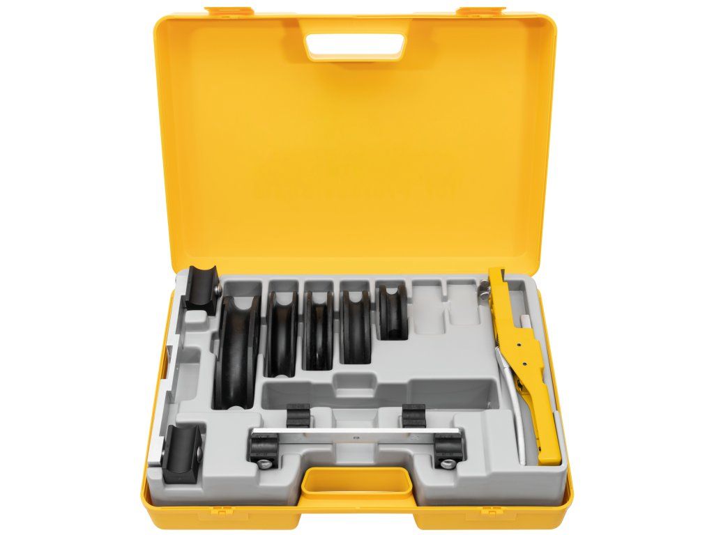 Ohýbací segmenty a příslušenství: sada obsahuje ohýbací segmenty pro uvedené rozměry, univerzální unášeč se smýkadly a další komponenty v pevném ocelovém kufříku.